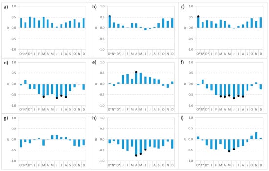 Monthly mean correlation coefficient between R (LF vs. TRI) and (a) mean annual maximum temperature, (b) mean annual minimum temperature, (c) mean annual temperature, (d) precipitation, (e) potential evapotranspiration, (f) ratio P/PET, (g) altitude, (h) latitude, and (i) longitude of every sampled site. Significant (p < 0.01) cases (black dots). Asterisks: Data from the previous year.