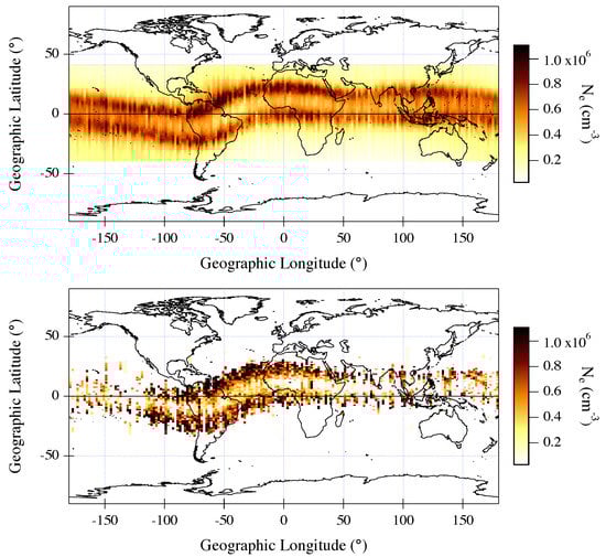 To select the plasma bubble events, we use Swarm Level-2 Ionospheric Bubble Index (IBI) product (http://earth.esa.int/swarm accessed on September 2020). This index, which identifies the occurrence of plasma bubbles analyzing the magnetic field variations associated with electron density depletions, can assume three values [47]. It is equal to 0 when there are not plasma bubbles, i.e., the plasma ambient is quiet; equal to −1 when it is not possible to determine with absolute certainty the presence of a plasma bubble, i.e., when data are outside of the night-side region or the quality is poor; and finally equal to 1 when plasma bubbles are detected [47]. Furthermore, when IBI=1 there is an additional flag, the Bubble Flag (BF), indicating the quality of plasma bubbles detection (see https://earth.esa.int/documents/10174/1514862/Swarm_L2_IBI_product_description accessed on September 2020). In particular, if this additional flag is BF=1 then we are in presence of a high correlation between plasma density and magnetic field signatures. Here, we chose the condition IBI = 1 and BF = 1 for the occurrence of a plasma bubble. The IBI is evaluated for each of the three Swarm satellites and is available with a sampling rate of 1 Hz. The top panel of Figure 1 reports the accumulated plot of in the latitude–longitude plane according to aforementioned conditions for all the selected time interval (i.e., 22 months), while the bottom panel of Figure 1 reports the accumulated plot of associated with plasma bubbles identified using IBI = 1, and BF = 1.