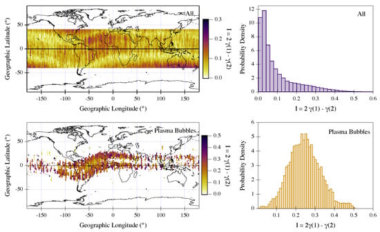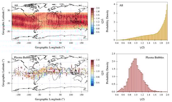The analysis is done on the entire time series. This means that we initially work on time series of around points (22 months with a time resolution of 1 Hz). Successively, we select the values of associated with the occurrence of plasma bubbles. Figure 2 reports the obtained results. It shows the values of associated with the plasma bubbles’ occurrence in the latitude–longitude plane (left bottom panel) and the corresponding histogram (right bottom panel). For comparison, the same figure on the top reports the distribution of in the latitude–longitude plane relative to the whole electron density dataset for selected conditions (18:00–24:00 LT, geographic latitude, ) and the corresponding histogram.