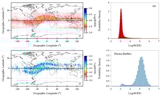 (Top): Rate of change Of electron Density Index (RODI) values associated with electron density data selected under the following conditions: 18:00–24:00 LT, geographic latitude, and in the latitude–longitude plane (left) and corresponding probability density (right). (Bottom): RODI values associated with the plasma bubbles in the latitude–longitude plane (left) and corresponding probability density (right).