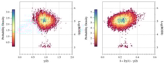 Joint probability densities between RODI and (on the left) and between RODI and Intermittency (on the right) inside plasma bubbles.