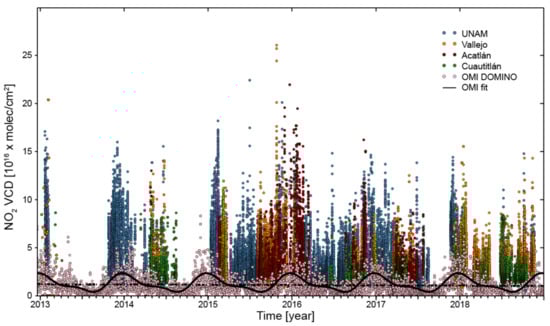The term represents the atmospheric state, for which the OMI instrument is expected to retrieve if the true atmospheric state is given by the state measured by the MAX-DOAS instrument. The retrieved NO VCD’s total series from MAX-DOAS and DOMINO between 2013–2019 are presented to show the differences between the NO VCDs retrieved from both instruments, ground and satellite, and a Fourier analysis was applied [17], in order to find a fit of its seasonality and the trend