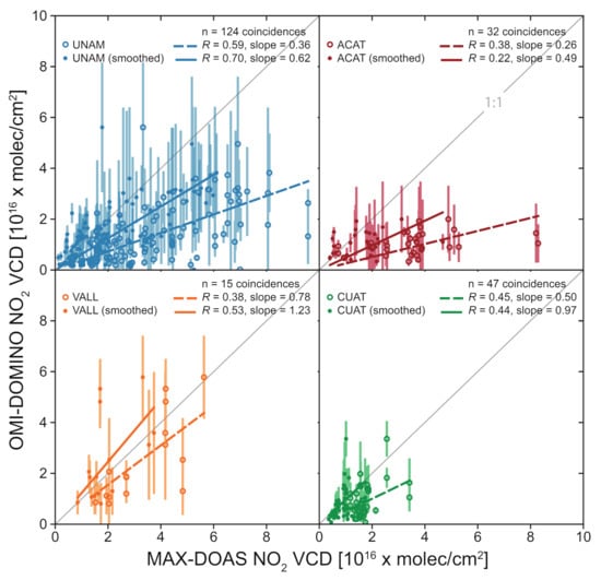 In Figure 5, we present the correlations obtained when MAX-DOAS data from all four stations (See Figure 4) are compared together with the closest pixel-measurements from OMI to each of the stations. The data were analyzed without (open circles) and with OMI’s AK smoothing of the MAX-DOAS results (filled circles) and a linear regression of the data-pairs were calculated. No significant change was observed in the overall Pearson’s correlation coefficient () after the MAX-DOAS data was smoothed; however, this procedure had a large effect on the slope of the linear fit increasing from 0.44 to 0.60.