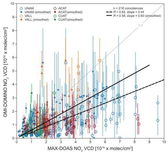 Figure 3 shows correlation plots with the Pearson’s correlation coefficients between each of the MAX-DOAS instruments and the OMI-DOMINO NO VCDs for those data pairs complying with the coincidence criteria explained before. MAX-DOAS VCDs are plotted with open circles and those with filled circles are calculated from smoothed profiles using the AK and a priori from the DOMINO product. This procedure is necessary when comparing remote sensing instruments (Section 2) according to Rodgers [16]. We use the DOMINO AK profiles to smooth the MAX-DOAS profile, by interpolating them to the 22 levels in the MMF output.
