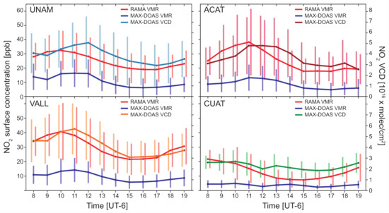 The diurnal cycles of the stations located within the city present maxima at 10–11 h LST, and a decrease in the afternoon due to the NO dilution effect in the mixed layer and various photochemical pathways. It can be noted that, on individual days, different behaviors can be observed depending on the meteorological conditions. These stations present correlation coefficients (0.62 < R < 0.73) revealing that the MAX-DOAS captures the variability rather well. In Cuautitlán, as mentioned above, there are various factors that contribute to a poor correlation with surface measurements (R = 0.34).