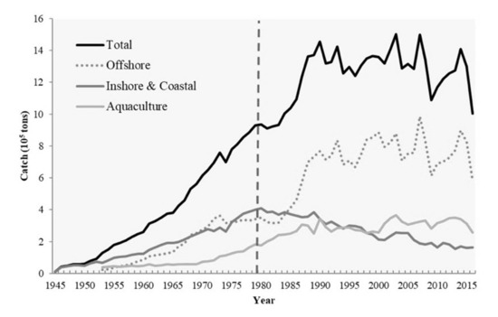 Average annual catch of Taiwan Fishery from 1945 to 2017. The black line, dotted line, dark gray line and light gray line represent the total, offshore, inshore and coastal, and aquaculture fishery, respectively (Fisheries Agency, 2018).