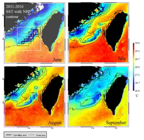 The monthly average data indicated that upwelling size and NPP were higher in June and July, and that in the waters around the TB, the SST, which is lower in summer, generally differs among the three habitats. For the summertime average SST difference between the upwelling habitat and fronts, non-upwelling is close to 0.7 and 1.5 °C, respectively. The SST was around 26 °C in TB upwelling, which was also within the SST ranges (24–26 °C) of upwelling areas shown in previous studies [1,3,6]. Furthermore, the SST gradient magnitudes of thermal front habitat calculated by Lan et al [6] were 0.1 to 0.2 °C/km and gradually disappeared in September. With other upwelling near TS, the average SST differences between upwelling and non-upwelling areas were 2 to 4 °C in the East China Sea and Dong Sheng upwelling [1,45].