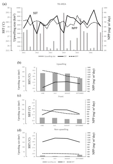 Time series showing the relationship of sea surface temperature (SST) with net primary production (NPP) and upwelling size in (a) the Taiwan Bank (TB) region, (b) upwelling habitat, (c) thermal front habitat, and (d) non-upwelling habitat. Monthly data are presented in (b–d).