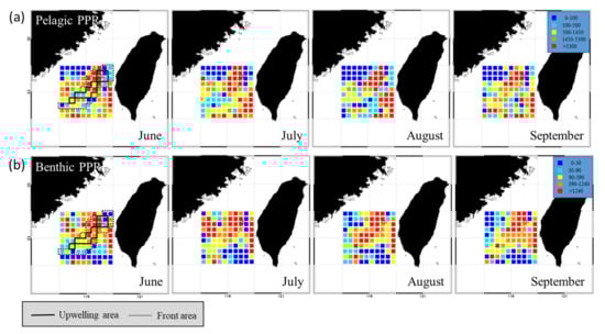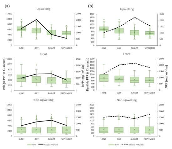 A positive association was observed between the NPP and PPR of benthic and pelagic species in all habitats for NPP concentrations of 500–1500 mg·C·m−2·day−1 in all three habitats (Figure 7 and Figure 8). Monthly NPP peaked in June and decreased gradually through September for both species types in all three habitats, whereas monthly PPR increased gradually from June to August. These results indicate that the relationship between PPR and NPP may be time-lagged (Figure 9). Moreover, upwelling size and SST (27–29 °C) were positively associated with the benthic PPR in the frontal habitat (Figure 7c,d).