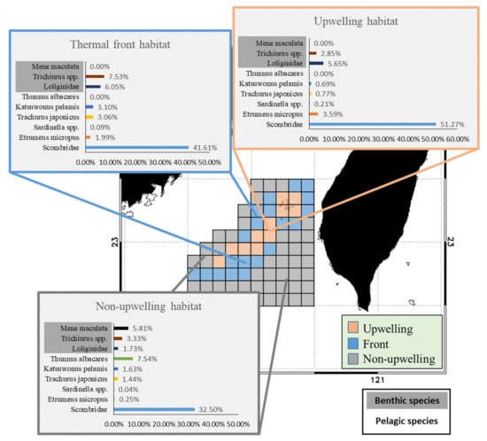 To understand the PPR, characteristics of marine environments, and fishery resource structure in the waters around the TB, we gridded the monthly environmental and fishery data onto eighty 0.2° spatial grids. All 80 grids were classified by habitat type (upwelling, frontal, or non-upwelling) according to results reported by Lan et al. [6], who detected summertime upwelling and thermal front locations using long-term SST data (Figure 1).