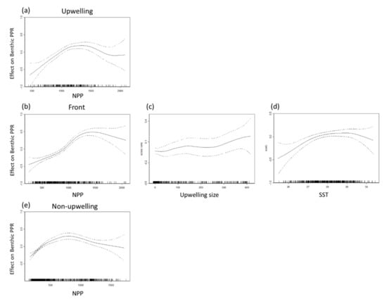 Partial residual plots of the effects of each factor on benthic primary production required (PPR) in the (a) upwelling habitat, (b–d) thermal front habitat, and (e) non-upwelling habitat.