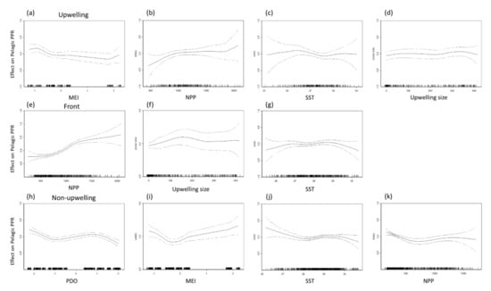 Partial residual plots of the effects of each factor on pelagic primary production required (PPR) in the upwelling habitat (a–d), thermal front habitat (e–g), and non-upwelling habitat (h–k).