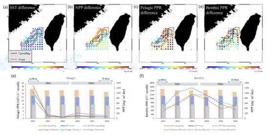 Comparison of differences in the annual average (a) sea surface temperature (SST), (b) net primary production (NPP), (c) pelagic primary production required (PPR), and (d) benthic PPR in the Taiwan Bank region during the La Niña (2011) and El Niño (2016) events, as shown in spatial images and (e) Pelagic, and (f) Benthic PPR with NPP time series. The black and red boxes represent the upwelling and frontal habitats, respectively.