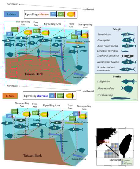 In the present analysis of fishery resource structure and the spatial distribution of PPR in upwelling, frontal, and non-upwelling habitats in the TB region in summer, variations in benthic PPR were correlated with changes in NPP. Members of the Loliginidae family, as well as M. maculata and Trichiurus spp., were the major benthic species in all three habitats. Variations in the pelagic PPR were influenced by ENSO events, and increased upwelling size contributed to lower SST and higher NPP in the TB region during La Niña events. High cPPR during La Niña events was observed for the pelagic species in the upwelling habitat, mainly those in the families of Scombridae (including A. rochei) and Carangidae. By contrast, during El Niño events, the dominant species were E. micropus and S. commerson. The frontal habitat marked the zone of transition between the two other habitats, and members of the Scombridae and Carangidae families and E. micropus had high cPPR in La Niña years. The high cPPR species during El Niño years were T. japonicus and K. pelamis. During La Niña events, the dominant pelagic species in the non-upwelling habitat were the same as those in the frontal habitat. During El Niño events, A. rochei rochei was the dominant species (Figure 11).