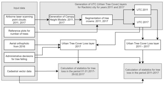 Two types of remotely sensed data were used in the study. The primary data set includes two acquisitions of ALS point clouds collected on 2011 (6 June 2011) and 2017 (5 March 2017). The ALS data set from 2011 was acquired within the framework of the country-wide ISOK project dedicated to the country’s protection against extraordinary threats []. The second acquisition in 2017 was performed as part of the CAPAP project []. ALS data were obtained by two standards: (a) standard I—applied mainly for forest and rural areas outside cities, where point cloud density was at least 4 points per square meter (ppsqm); (b) standard II—applied in 94 cities in Poland [], with a density at least 12 ppsqm. The ALS point clouds were previously classified by data providers according to the specifications of the American Society for Photogrammetry and Remote Sensing (ASPRS) for LiDAR Exchange Format (LAS 1.2). The second type of remotely sensed data were digital aerial orthophotomaps available in natural color composites (RGB) through the Google Earth application (Table 1). The orthophotomaps were used as an additional data source to make the UTC layer up-to-date at the beginning of the period of no tree removal permit regulations for private purposes (Figure 2).