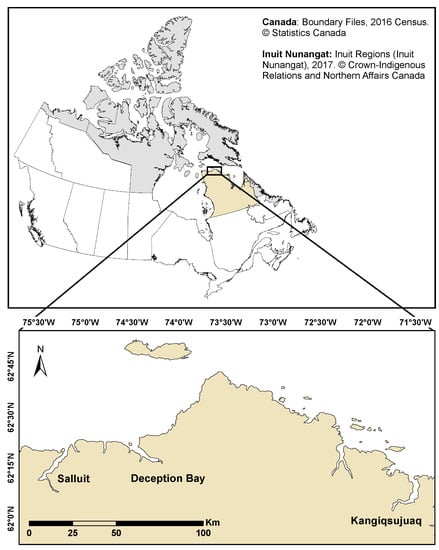- Nickels, S.; Furgal, C.; Buell, M.; Moquin, H. Unikkaaqatigiit—Putting the Human Face on Climate Change: Perspectives from Inuit in Canada, pre-release english only version ed.; Inuit Tapiriit Kanatami, Nasivvik Centre for Inuit Health and Changing Environments at Université Laval and the Ajunnginiq Centre at the National Aboriginal Health Organization: Ottawa, ON, Canada, 2005; Available online: https://www.itk.ca/wp-content/uploads/2016/07/Nunavik.pdf (accessed on 13 February 2021).