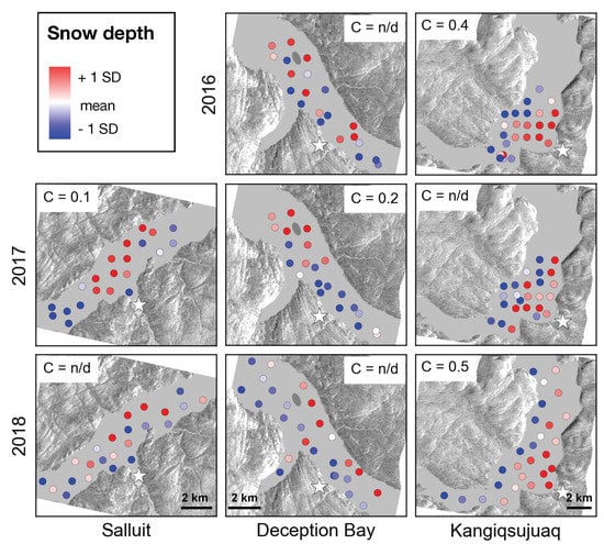 - Bernier, M.; Dufour-Beausejour, S.; Gilbert, V.; Rouleau, A.; Tuniq, J.; Gauthier, Y. Ice Monitoring: Ice and Snow Thickness Data from Salluit Fjord, Deception Bay and Kangiqsujuaq (Nunavik, Canada); Canadian Cryospheric Information Network: Toronto, ON, Canada, 2017. [Google Scholar]