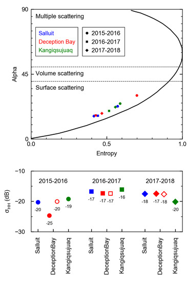 - Gill, J.P.S.; Yackel, J.J.; Geldsetzer, T.; Fuller, M.C. Sensitivity of C-band synthetic aperture radar polarimetric parameters to snow thickness over landfast smooth first-year sea ice. Remote Sens. Environ. 2015, 166, 34–49. [Google Scholar] [CrossRef]