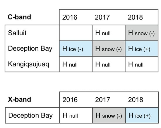 - Nandan, V.; Geldsetzer, T.; Mahmud, M.; Yackel, J.; Ramjan, S. Ku-, X-and C-Band Microwave Backscatter Indices from Saline Snow Covers on Arctic First-Year Sea Ice. Remote Sens. 2017, 9, 757. [Google Scholar] [CrossRef]