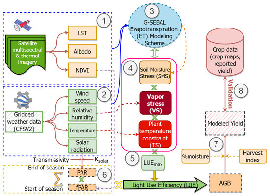 Schematic overview of the methodology used for estimating the crop yield; components of analysis include: (1) obtaining estimates of land surface temperature (LST), surface albedo, and normalized difference vegetation index (NDVI) applied to Landsat data as inputs to the Surface Energy Balance for Land (SEBAL) evapotranspiration (ET) modeling scheme; (2 and 3) translating the gridded weather variables obtained from the CFSV2 product within the Google Earth Engine (GEE) platform into ET; (4) incorporating the soil moisture stress (SMS), vapor stress (VS), and plant temperature stress (TS) into the light use efficiency (LUE) model; (5) reducing the LUEmax to the actual LUE by accounting for environmental stresses; (6) remote sensing of absorbed photon flux (absorbed photosynthetic active radiation (APAR)), which is a product of photosynthetic active radiation (PAR) and the fraction of photosynthetic active radiation (fPAR); (7) estimating crop yield as the ratio of the accumulated above-ground biomass (AGB) multiplied by the harvest index (HI) to the % moisture content of the crop at harvest; and (8) comparing the ground-observed and modeled crop yield.