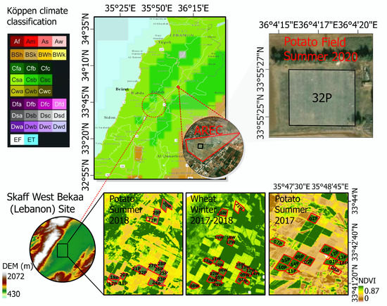 Location of Skaff (West Bekaa) and AREC (Lebanon) sites. Parcel boundaries for the studied Skaff farms are shown in red, and one analyzed potato crop at the AREC site is shown in black. All experimental fields are labeled by field ID (the count of field and a letter of P/W corresponding to potato/wheat). DEM is the digital elevation model from the Shuttle Radar Topography Mission (SRTM) with a 30 m spatial. NDVI is the normalized difference vegetation index (30 m) derived from Landsat 8 (satellite overpasses (dd/mm/yy: 17/07/18,12/04/18, and 07/07/20)). Köppen–Geiger climate map calculated from temperature indices and precipitation normals of the period 1986–2010, 5 arc/min resolution [97,98].