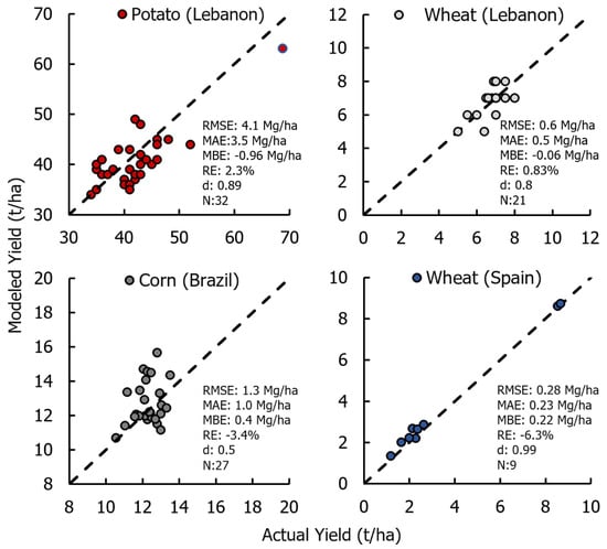 To assess the accuracy of the yield estimations, the statistical indicators root-mean-square error (RMSE), mean absolute error (MAE), mean bias error (MBE), relative error (RE), and index of agreement (d) between the estimated and actual yield values are calculated: