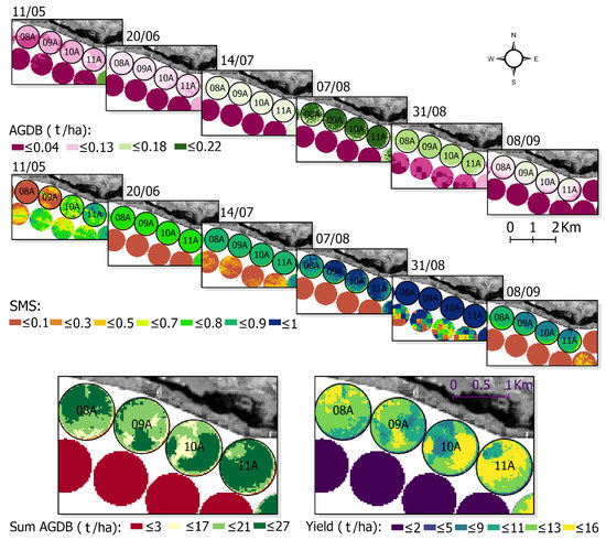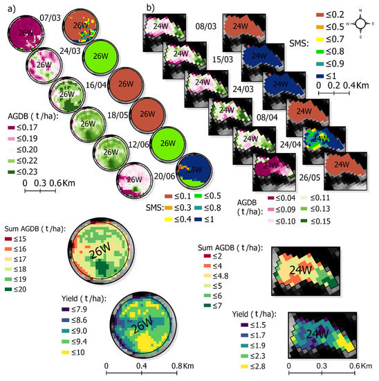 - Campos, I.; González-Gómez, L.; Villodre, J.; Calera, M.; Campoy, J.; Jiménez, N.; Plaza, C.; Sánchez-Prieto, S.; Calera, A. Mapping within-field variability in wheat yield and biomass using remote sensing vegetation indices. Precis. Agric. 2019, 20, 214–236. [Google Scholar] [CrossRef]