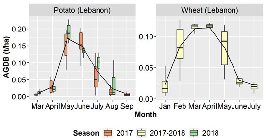 The actual yield dataset for the analyzed fields was collected via an interview with the Skaff farms’ farmer-manager. This approach of data acquisition is referred to as the recall method [99]. The data records were obtained on crop maps, areas planted, crop type, and crop yields for three consecutive seasons: summer 2017, summer 2018, and winter 2017–2018. Agronomic measurements for estimating the harvest index (HI) and crop moisture content (%) parameters were conducted for Skaff fields (West Bekaa, Lebanon). These measurements were taken during the late growing season of the crops (May–September 2018) over two potato and three wheat experimental fields located in West Bekaa (Lebanon). The quadrate was randomly thrown in the field, and the vegetation within the frame of the quadrate was clipped. Three samples of the biomass were taken from each field, and the obtained results were averaged. The above-ground plant component was oven-dried at 75 °C for 48 h to a constant weight and weighed. The water content of the plants was determined by subtracting the above-ground dry mass from the fresh above-ground mass. The crop moisture content (%) was determined by dividing the water content by the fresh crop weight. The experimental verification of potato moisture content (%) showed that the percentage moisture content of potato tuber varies between 75% and 78% (Table S1). As for wheat, the moisture content of grains ranged between 12% and 15% (Table S2). In this study, we used a value of 0.75 for the potato HI and 0.4 for the wheat HI (Table 2), as verified by the literature.