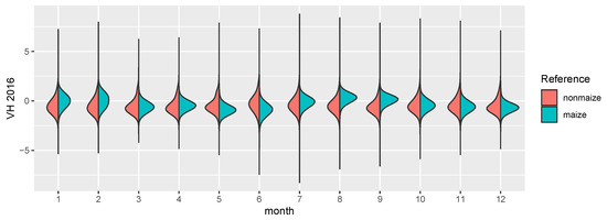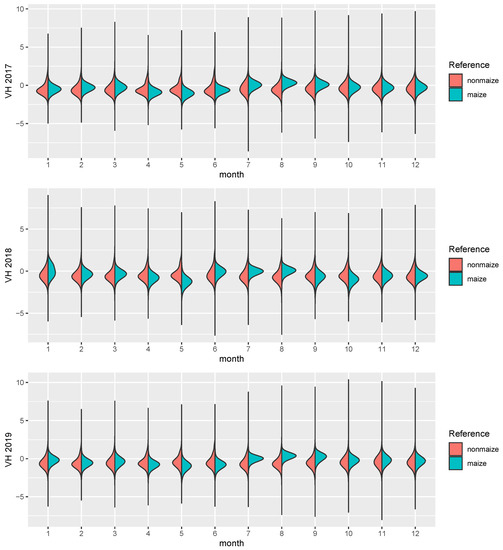 The focus of this study is the transferability of image based models on a regional scale, both temporally and spatially. Consequently, SAR imagery is well suited as a prediction input. While it is much harder to interpret visually and the signal of the phenology is not as clear as in the reflectances of a vegetation spectrum, it is largely unaffected by atmospheric conditions. While it is affected by topography and soil water content, monthly timeseries can be derived consistently, which show distinct temporal patterns for certain crop types [43]. Along with the benefit of temporal consistency, SAR imagery comes with other downsides, most importantly the complete lack of information about leaf pigments [22] and generally lower ground sampling distance (GSD). The sensor used in this study is the C-band SAR mounted on the Sentinel-1 satellites A and B. We used the ground range detected (GRD) product with the instrument mode interferometric wide swath. GRD imagery provides the advantage of speckle and noise reduction through multi-looking (5 looks in this case), at the cost of losing the phase information of the signal, as well as an increased GSD. We used the level 1 GRD high resolution product with vertical transmit/horizontal receive polarization, which has a GSD of 10 m [44]. VH crosspolarized SAR data benefits from the increasing interaction of transmitted and received waves, as the canopy height develops [45]. The data was processed in and downloaded from the google earth engine (GEE, cf. [46]). GEE Sentinel-1 datasets are pre-processed by the Sentinel-1 Toolbox, which means that thermal noise removal, radiometric calibration and terrain correction algorithms were applied. Since the Sentinel-1 constellation has a revisit time of roughly 6 days, and 12 days in 2016 because there was only Sentinel-1 A, monthly means could be computed for every single pixel. This lead to a consistent 12 band image with 10 m GSD for all 4 years. In a last step, each image was scaled. Figure 3 shows the distributions of both classes in the images. Though SAR is invariant to pigment features of the canopy, even on this aggregated level the growth curve of maize, starting around June and ending in September/October, is visible. One example year is visualized in Figure 2, where the maize fields have a distinct green/turquoise hue, which indicates a peak in Augst/September, as opposed to the red crops which are also visible.