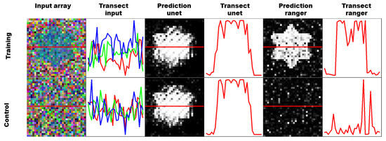This problem is visualized in Figure 4, where training cells were artificially generated with a very specific star shape. Pixels that are known to be maize are randomly drawn from the image data and used to fill the star. Pixels that are known to be not maize are used to fill the rest of the cell, as well as an additional artificial control cell. The star shaped cells are then used to train a UNET CNN as well as a ranger classification model. The figure shows one prediction of a training cell, and a control cell for each classifier. The training prediction works well for both models, and the star shape is clearly visible. The control cell however, contains no pixels from maize fields, and the ranger classifier shows only a small amount of noise and misclassified pixels. The UNET classifier however, shows almost the exact same picture, which means that it was overfitting the geometry of the field, and seemingly did not include the numeric information of the pixel features at all.