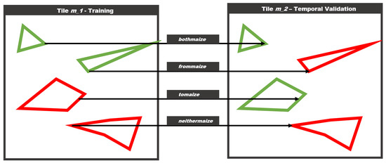 Resampling from a large dataset spanning an entire region for multiple years, provides the unique opportunity to specifically assess this kind of overfitting problems. Thusly, we introduce four additional scopes, that are a subset of the temporal scope defined in Table 2 since they only apply to tile m_2, which has the same geometry but data from a different year. One caveat of this approach is that the geometry between two years is not exactly the same. There are some differences between polygon geometries from all four years, but they are usually very minor, and this simplification should have little impact on the overall conclusion of the study. The scopes themselves are described in Figure 5. The scope bothmaize includes fields that have been maize in the training year, and still are maize in the validation year, while the scope frommaize includes fields that were maize, but are not anymore.