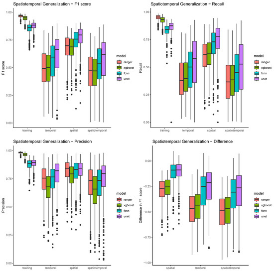 The same pattern, spatial generalization being better than temporal, and temporal generalization being better than spatiotemporal, can be observed when just looking at the differences in scores (see Figure 9). The validation score differences show, compared to the absolute performance scores, relatively low standard deviations. Both pixel based methods and both convolution based methods show similar value ranges in the spatial comparison scope, with convolution based methods losing much less performance. The performance difference in the temporal and spatiotemporal validation is much higher, and the difference between all models gets more pronounced.