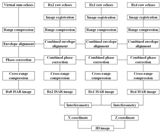 | Step 7: Perform interferometry for the ISAR images of Rx1 and Rx2 to obtain the scatterer coordinates in the horizontal direction according to equations (28) and (30). Meanwhile, perform interferometry for the ISAR images of Rx1 and Rx4 to obtain the scatterer coordinates in the vertical direction according to equations (29) and (31). |