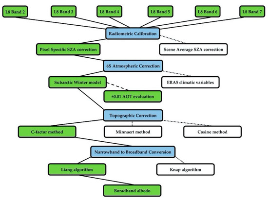 At each step of the process to derive albedo from satellite data, different variants of the same corrections were proposed, in order to obtain the combination of corrections that provides the lowest statistical errors and highest correlation with in situ observations. The complete proposed model, and all the variants for each step, are shown in the workflow in Figure 1.