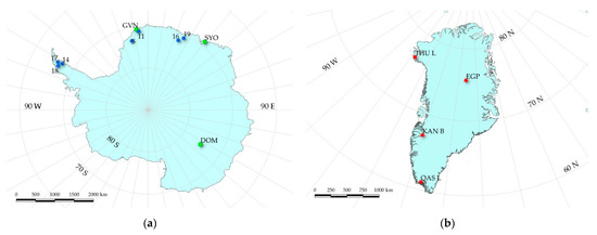 Location of the in situ stations employed in this study, in Antarctica (IMAU–Institute for Marine and Atmospheric Research Utrecht in blue and BSRN–Baseline Surface Radiation Network in green) on the left (a) and in Greenland (PROMICE–Programme for Monitoring of the Greenland Ice Sheet in red) on the right (b).