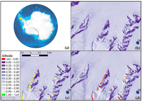 The albedo has a relevant role in the energy budget studies above all at the Poles, where it is generally high owing to the large fraction of surface area covered with snow and ice. Variations from these high albedo values could deeply affect the surface mass balance, leading to serious consequences, considering that the Antarctic and Greenland ice sheets have a crucial role on sea level control. The albedo (α), also called bi-hemispherical reflectance, is defined as the ratio of the radiant flux reflected from a unit surface area into the whole hemisphere to the incident radiant flux of hemispherical angular extent [1] in the approximate spectral range 350–3000 nm [2]. On the ice sheets, it depends on different factors, i.e., snow metamorphism, including changes in the size and shape of snow grains [3,4,5,6,7], snow density and stratification, the occurrence of various surface morphologies owing to strong and persistent winds (e.g., sastrugi, snow dunes and wind glaze areas), or the presence of blue ice [8,9,10]. In turn, the rate of snow metamorphism is influenced by temperature, relative humidity and wind [11,12,13]. Historically, the albedo has been acquired, especially on the ice sheets and ice shelves, by instruments mounted on automatic weather stations (AWSs), that record measures of albedo at a hourly or sub-hourly temporal resolution [14,15,16,17,18]. However, while the surface covered by these punctual records can approximate a Landsat satellite pixel [19], it cannot be considered representative of a large area, i.e., an entire glacier or ice sheet [20]. Alternatively, during field campaigns, distributed measurements can be acquired by using portable radiometers [21,22]. However, many of these instruments would be required to cover such a wide area as a glacier, more so an ice sheet. In this context, remote sensing acquires relevance. NASA already provides a series of albedo products obtained by combining observations from the Moderate Resolution Imaging Spectroradiometer (MODIS) sensors on board the Terra and Aqua satellites. MODIS was used in the past to study the ice sheets, both in Greenland [23,24,25] and in Antarctica [6,26,27], but its spatial resolution is too coarse (i.e., at most, 500 m) to satisfactorily represent albedo variability of local features of the ice sheet (e.g., blue ice, wind glaze zones).