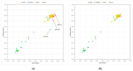The plots show the validation of satellite retrieved albedo (Landsat 8 OLI) using in situ observations: (a) IMAU in red, BSRN in yellow (Antarctica) and PROMICE in green (Greenland), (b) cleaned dataset. The arrows indicate the anomalous data.