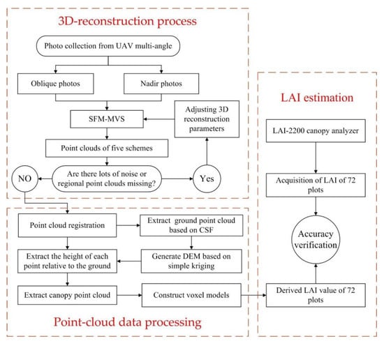 The specific methods followed in this study are summarized in Figure 3, which is mainly divided into three parts: (1) 3D-reconstruction process; (2) point-cloud data processing; (3) LAI estimation. The code for voxelization model and LAI fast extraction is detailed in the attachment.