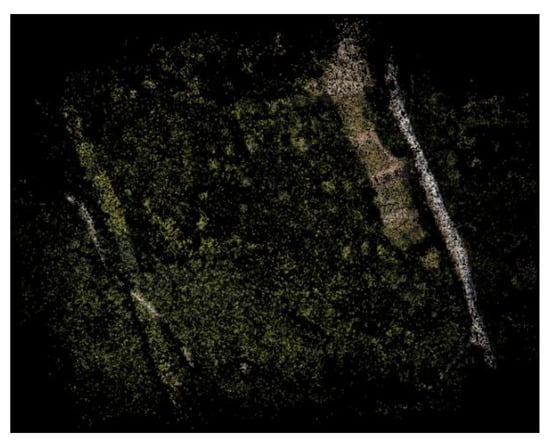 Recently, various photogrammetry technologies of generating 3D scenes from 2D images (shape from texture (SFT) [,], shape from shading (SFS) [,,], structure-from-motion and multi-view stereo (SFM-MVS) workflow ([]; etc.) have been developed in the field of computer vision to obtain three-dimensional point clouds of object surfaces at very low cost. Among these methods, the SFM–MVS workflow is the most efficient for reconstructing 3D structure of a scene by analyzing the geometric constraints between the image sequences captured by cameras in different positions []. The SFM–MVS workflow has been successfully applied to single-wood level 3D reconstructions based on ground photography []. However, large-scale ground surface 3D reconstruction based on drone photography still faces various challenges like positioning accuracy, camera and lens posture correction. Traditional photogrammetry generally only uses drone orthophotos as raw materials for the SFM-MVS workflow [,,] because of the excellent homology point matching results, but which will result in incomplete three-dimensional canopy structures in forest scenes. The point cloud information derived from SFM-MVS is closely related to the content contained in the pixels of the original photo. Due to the canopy occlusion effect, the canopy information obtained by nadir photos is generally missing, mainly in the middle and lower part of the canopy, which will seriously underestimate the leaf area estimation. Recently, oblique photography has attracted great attention as photos from tilt angles and can obtain more side structure of target scenarios than nadiral photography [,,], which overcomes the limitation of traditional photogrammetry. Hence, coupling photos from different lens angles based on the SFM-MVS workflow should result in a relatively complete forest canopy structure.