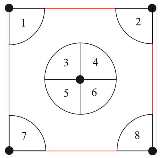 Schematic diagram of Leaf Area Index (LAI) field measurement scheme. The red line is the boundary of the sample plot, the black spot is the measuring station and the fan-shaped area is the orientation of LAI-2200 canopy analyzer probe rod.