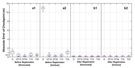 Boxplots describe the checkpoint absolute errors of the five schemes before and after point cloud registration in vertical and horizontal directions. Before point clouds registration (a1: horizontal direction; a2: vertical direction); after point clouds registration (b1: horizontal direction; b2: vertical direction).