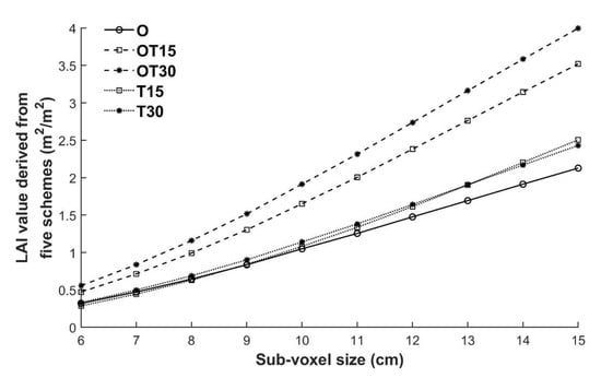 The derived LAI values were obtained from the 10-voxel models generated by each of the five schemes (Figure 7). Overall, the LAI derived from the five schemes increased with the increase in the sub-voxel size. For different voxelization models, OT30 always provided LAI estimates higher than O, OT15, T15 and T30. The LAI estimates provided by T15 and T30 were very close, and O always provided the lowest LAI estimate among the five schemes.