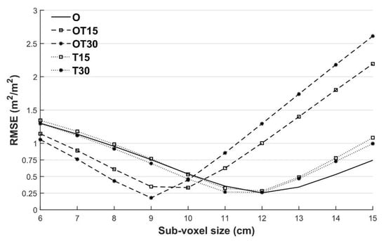For the five schemes, the sub-voxel sizes corresponding to the slope a, intercept b, the highest R2 and the lowest RMSE of the linear fitting were explored. O, T15 and T30 give the best LAI estimates at the sub-voxel size of 0.12 m, while OT30 gives the best LAI estimates at the sub-voxel size of 0.09 m and OT15 gives the best LAI estimates at the sub-voxel size of 0.10 m (Table 1). This result is consistent with the RMSE result (sub-voxel size is 0.12 m: RMSE (O) = 0.2538 m2/m2, RMSE (T15) = 0.2824 m2/m2, RMSE (T30) = 0.2609 m2/m2; sub-voxel size is 0.10 m: RMSE (OT15) = 0.3333 m2/m2; sub-voxel size is 0.09 m: RMSE (OT30) = 0.1790 m2/m2) (Figure 8 and Table 2). Although the three single-angle schemes also provide good LAI estimation accuracy, the most suitable sub-voxel size is larger than that of OT15 and OT30. This shows that the completeness of O, T15 and T30 canopy information is lower than that of OT15 and OT30 (Figure 8).