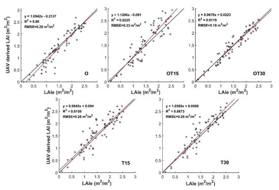 Each of the five schemes had a good linear fitting relationship with the LAI value measured on the field under the sub-voxel size that is most suitable for estimating LAI. The results of OT30 were stably distributed around Y = X, and its accuracy verification results are the best among all the schemes (Figure 9). The LAI values derived from the other four schemes had a relatively high degree of dispersion with the LAI values measured on field. Generally speaking, between the same kind of schemes, the LAI estimation provided by the multi-angle scheme was better than with the single-angle scheme (OT30 better than T30), and the LAI derived from adding the 30° photo was better than the one with the 15° photo (OT30 better than OT15; T30 better than T15) (Figure 9). However, the best LAI estimation accuracy of OT15 was worse than the other four schemes, which may be related to the poor image matching between the oblique photos of OT15.