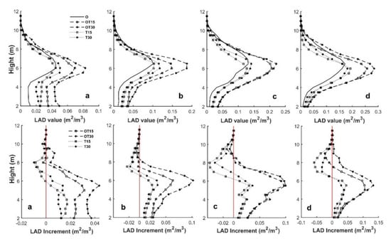 In areas with different LAI levels, the leaf area density (LAD) distribution and the LAD increment relative to O of five schemes at different heights from ground (sub-voxel size is 0.09 m). a is the area with LAI interval 0.5–1, b is the area with LAI interval 1–1.5, c is the area with LAI interval 1.5–2, d is the area with LAI interval 2–2.5.