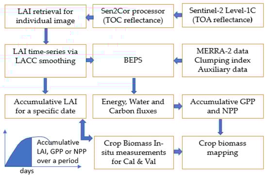A diagram of the data processing flow for mapping crop biomass using Sentinel-2 data and the Boreal Ecosystems Productivity Simulator (BEPS).