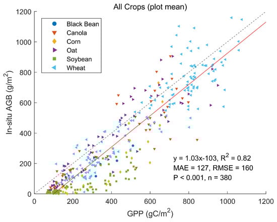 Although non-linearity is shown between GPP and AGB of corn, correlation is still high (R2 = 0.76) (Figure 4). This suggests that C3 models may be used to simulate GPP of C4 plants if some parameters are adjusted accordingly, although this is subject to further investigation. The correlations between LAI and crop AGB are shown in Figures S4 and S5. For all crop types, crop LAI explains only 50% of variation in crop AGB, significantly lower than that explained by crop GPP (Figure S4); this is because LAI only explains mostly the top part of total AGB; as crop structure varies, the non-leaf part the AGB has a significant difference; for example, corn has far more non-green AGB than the soybean does. This suggests that the cumulative GPP correlates better to AGB which is also a cumulative variable, than it does to the green LAI, which indicates the status of the crop. By crop type, the LAI variations of canola, oat, and wheat explain only 61%, 59%, and 0% of variations in their corresponding AGB, respectively. The LAI variations of black bean, corn, and soybean explain 94%, 81%, and 62% of the variations in their AGB, respectively, higher than that of canola, oat and wheat. This difference can be explained by the growing stages: unlike canola, oat, and wheat, the AGB of black bean, corn and soybean cover only the vegetative growth stage of crop phenology. This is evidenced by the stronger correlation between leaf biomass and LAI (R2 = 0.55) than between AGB and LAI (R2 = 0.32%) as shown in Figures S6 and S7. Ideally, the LAI should be highly correlated with leaf biomass. However, LAI values derived from Sentinel-2 are equivalent “green” LAIs, resulting from the accumulation leaf pigments and leaf senescence [74]. Therefore, satellite-derived LAI correlates more with green biomass including green stems and fruits [75] and the R2 of 0.55 is still considered to be high.