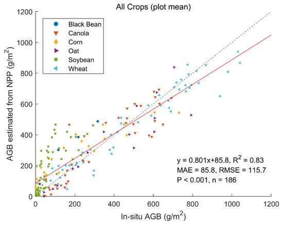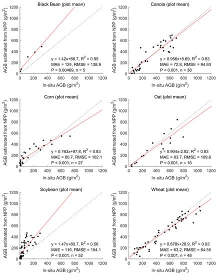 The R2 between the simulated NPP and AGB for all the plots is 0.83 (Figure 5); individual R2 ranges from 0.56 to 0.95 for the six crop types (Figure 6). There are minor improvements in R2 compared to GPP-derived AGB, except for black bean for which the R2 is already very high, and for soybean. Similar to GPP-derived AGB, a non-linearity between simulation and measurements is still observed for corn. Since we used the same biomass respiration rates for different crops in BEPS simulations, the minor differences between GPP-derived and NPP-derived AGB are expected. Overall, the RMSE and mean absolute error (MAE) for AGB estimation from NPP are 115.7 and 85.8 g m−2, respectively.