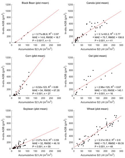 Similar to this work, two recent studies have used Sentinel-2-derived LAI for biomass and yield mapping. Punalekar et al. [84] reported that the R2 between pasture biomass and LAI ranges from 0.16–0.73 to 0.22–0.76, for the NDVI-derived LAI and radiative transfer model-based LAI, respectively. Lambert, Traoré, Blaes, Baret and Defourny [30] demonstrated that the R2 values between LAI and yield are 0.68, 0.62, 0.8 and 0.48 for cotton, maize, millet and sorghum, respectively. Here, we show that the R2 values between GPP and AGB range from 0.65 to 0.96 for six annual crops which dominate Manitoba’s agro-ecosystem. Despite these aforementioned challenges, our study demonstrates the advantage of using LAI time-series and integrating both biotic and abiotic factors for biomass mapping at very high spatial resolutions.