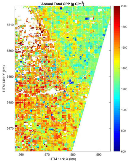 BEPS-simulated GPP for the whole growing season is shown in Figure 9. The lower-right corner is excluded from analysis due to biases in LAI retrievals. In the study area, the crop’s total GPP in the whole growing season ranges from 600 to 2000 g C m−2 yr−1. Lower GPP values in the upper-right corner are associated with a region of heavy clay soil; for this clay area, the matric water potential can be very low even when the soil water content is relatively high, limiting available water to the crops (Figure S1). The area with center-pivot irrigation (circles; potatoes according to Figure 1) is characterized with high GPP values up to 2000 g C m−2 yr−1. The variation of GPP is generally small within each field, while considerably larger among different fields, reflecting individual farmer’s management on irrigation and fertilizer use.